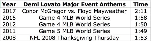 Pausing and long-winded words are the norm for Lovato as both can be found in the five performances listed below. That includes her first anthem, when she was 16 years old, prior to the Dallas Cowboys vs. Seattle Seahawks 2008 Thanksgiving clash. It’s also notable that Lovato takes her time while singing the second half of the anthem. That’s especially true during the final two versus which Lovato takes an average 42.4 seconds to complete.