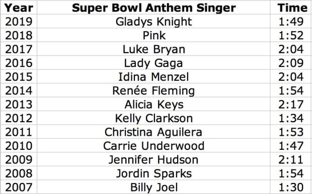 Following a run of marching bands, trumpet players like Wynton Marsalis and Herb Alpert, plus of mix of individual singers, the National Anthem has been performed almost exclusively by a single singer since Super Bowl 23 in Miami. On that day, at Joe Robbie Stadium in 1989, Billy Joel had the honor and was all business during a 1:24 sprint through the anthem. Tracking this prop for years, here are single artist renditions dating back to Super Bowl 41 in 2007.