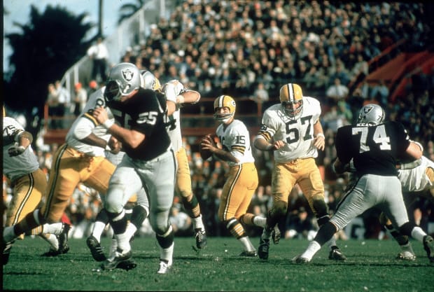 Green Bay Packers QB Bart Starr (15) looks for open receiver vs. Oakland Raiders during Super Bowl II.