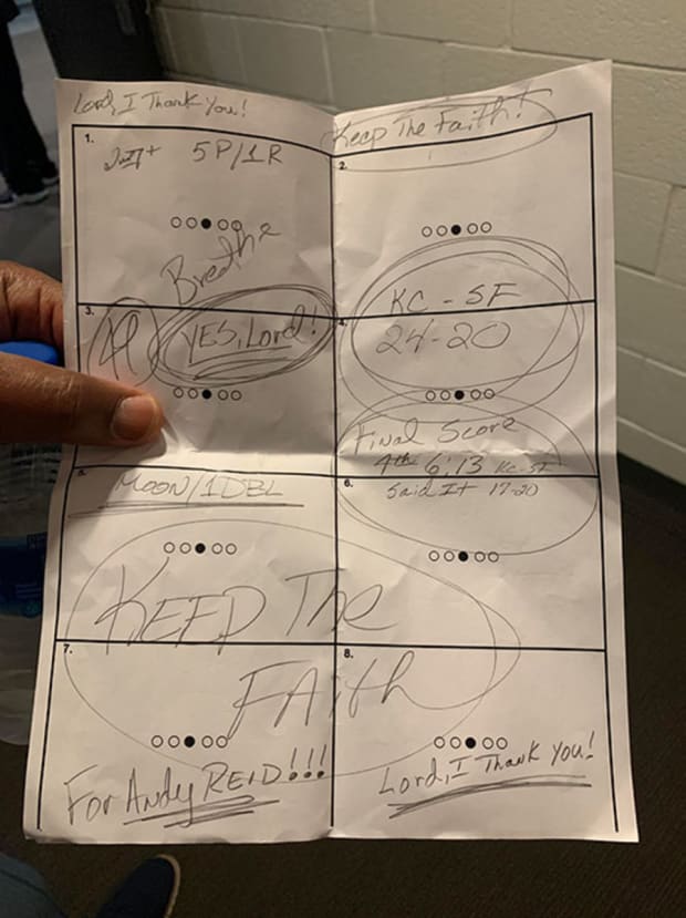 2. In the Chiefs locker room after the Super Bowl, safeties coach David Merritt showed me one of the sheets he uses to chart formations and keep notes during the game. In the top quadrant at the left side, he’d written, “Breathe.” That was one of the reminders he’d given his players in the days leading up to the game; he’d even had them do a mindfulness session in which they counted their breaths to relax. You may remember the TV shot of Tyrann Mathieu fired up on the sideline after the 49ers scored on their second straight drive in the second half to take a 20-10 lead. Mathieu then put on a headset to communicate with Merritt, who was up in the coaches’ box, and the coach reminded the heart and soul of the Chiefs defense to breathe. That was, of course, the last time the 49ers scored. Also on Merritt’s sheet: At the 6:13 mark of the fourth quarter, when the Chiefs scored to pull within 20-17 of the 49ers, he wrote down that the final score would be KC 24, SF 20 (he didn’t count on the Chiefs scoring two more times). In the bottom left-hand corner, one more note, something echoed by the entire team in Miami: “For Andy Reid!!!”