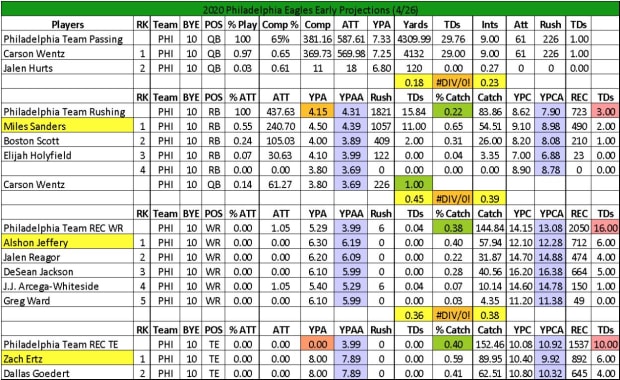 Philly projects as somewhat of a balanced offense. QB Carson Wentz finished with 607 pass attempts in both of his full seasons in the NFL, which comes out to 37.9 passes per game (the league average in 2019 was about 35 passes per game).