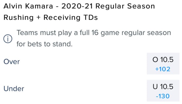 Unless you're projecting a long-term injury, his unluckiness from 2019 to continue or a major downgrade to the Saints' offense as a whole, there's no reason to believe Kamara won't hit the over. He's averaging 13.2 touchdowns per 16 games in his career.