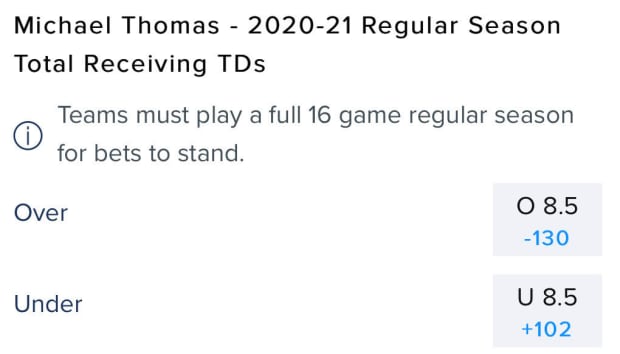 The oddsmakers at FanDuel Sportsbook have set Thomas’ total number of touchdown receptions in 2020 set at 8.5, juiced moderately to the over at odds of -130.