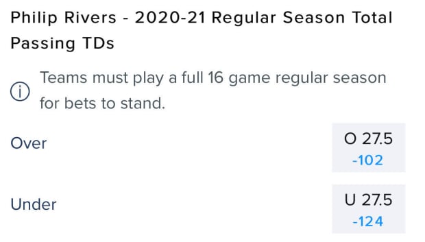 Let's see what the oddsmakers think, particularly when it comes to passing touchdowns. Here's FanDuel Sportsbook's posted total for Rivers in 2020: