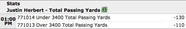 2020 regular season prop options, bookmakers have set Herbert’s total passing yards at 3,400. Under (-130) is the favorite while OVER (-110) is a slight underdog.