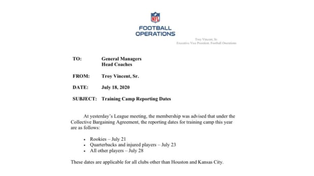The NFL sent a memo to it’s 32 teams Saturday reiterating the reporting dates for training camp which are still applicable under the current collective bargaining agreement.