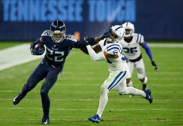 Over five seasons, Henry has built up a catalog of such moments, with all sorts of variations. He’s pushed defenders out of his way with a flick of his hand or with a statuesque shove, in the regular season and in the playoffs, in tight games and in blowouts. Here’s an example—definitive for almost anyone else, ho-hum for Henry—from the opening drive of Tennessee’s crucial Week 12 win over the Colts, in which he ran for 178 yards and three touchdowns. Quarterback Ryan Tannehill pitched the ball left and the Titans’ line fanned out, but defensive tackle Taylor Stallworth snuck through, taking clean aim at the back. At the point of contact, Henry snapped a palm into Stallworth’s facemask, which had the effect of a straight right hand to the chin of an encroaching boxer, dropping the defender and opening the edge for a 12-yard gain and a first down. At 300-plus pounds, Stallworth outweighs every back in the league, but this outcome somehow didn’t register as a surprise. "Henry … stiff-arm … turns upfield," was all CBS announcer Ian Eagle needed to say.